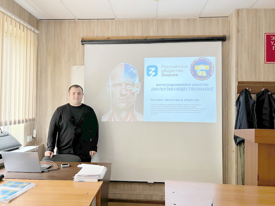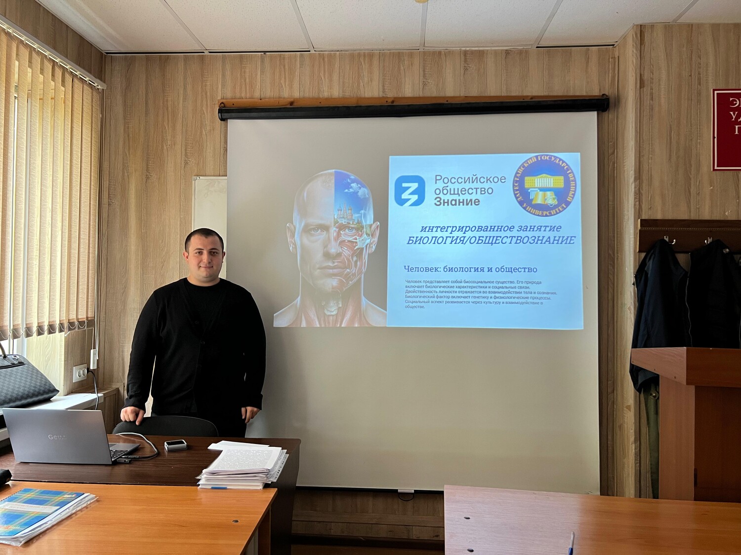 Преподаватель обществознания отделения СПО, лектор Всероссийского общества «Знание» Шарип Чапаев совместно с преподавателем биологии Абидат Гаджимурадовой провели интегрированное лекционное занятие по биологии и обществознанию на тему «Человек: биология и общество».